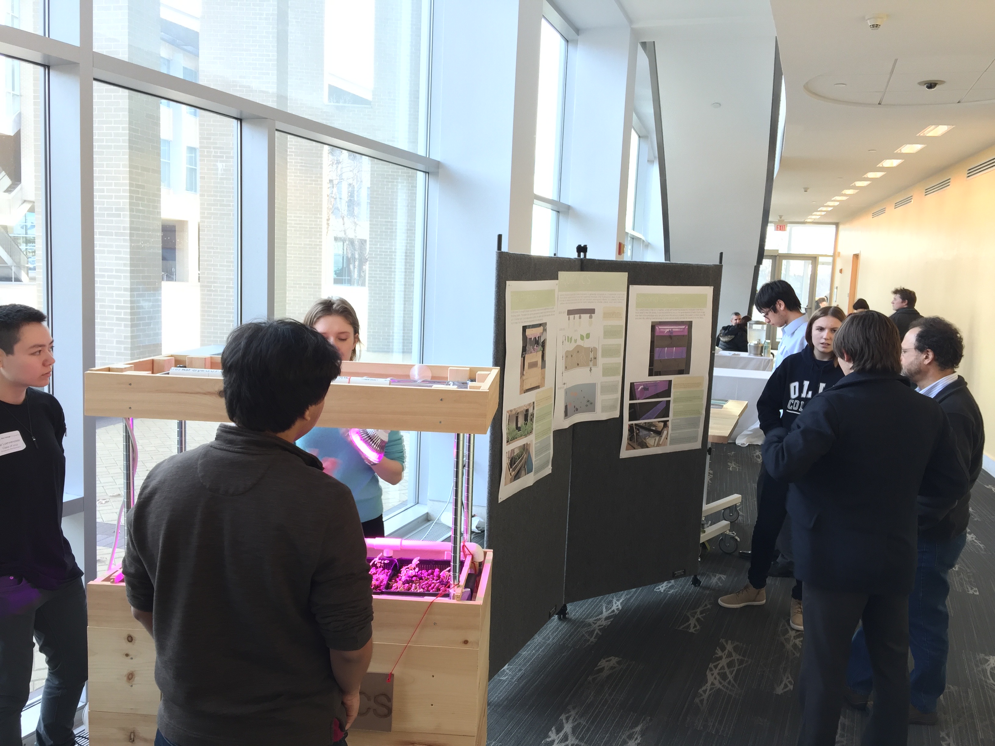 In the Spring of 2017, I doubled down on efforts to build the library shelf system. We hit the ground running and immediately began plans for construction. I worked extensively on maintaining the old system while also helping with the electrical team to create the sensors and control box. My team of organizers and I also put in the extra effort to coordinate between teams and ensure that the direction one team was going would complement the direction of another team. I made sure to talk to each subteam lead every meeting to keep up to date on their activities and inciting discussions between teams should unknown conflicts be discovered. Due to our efforts to improve coordination, we actually caught a number of pitfalls where teams were planning on constructing conflicting designs, thus preventing a potential disaster come build time. As the principal lead, I also dealt with the high level organizational work, such as buying supplies from vendors, handling budget and logistics, and maintaining a steady schedule for the subteams. Our design changed a number of times as we encouraged and performed numerous unit tests to ensure functionality. Iterative prototyping was used extensively throughout all teams, at the advice of the organizers. By the end of the semester and a few late nights on behalf of the organizers, we had successfully built out the library shelf. We even tested its functionality and managed to grow some starter basil in it. Our system could fit up to 75 individual basil plants, and the system's efficient nutrient distribution expedited growth times for potentially monthly harvests. The school librarian was very impressed with our finished system, and at EXPO, while we couldn't bring the system with us since it was set into the library wall, we heard ample compliments from visitors and some buzzing talk among the crowd about a plant farm and an aquarium in the Olin library. But of course, this is just the bare bones of a functional system. Come next semester, we plan on iterating further on this system and improving its aesthetic and mechanisms. Once the library shelf system is fully polished and operational, we will be able to advance our mission of creating a sustainable garden in the Olin library.